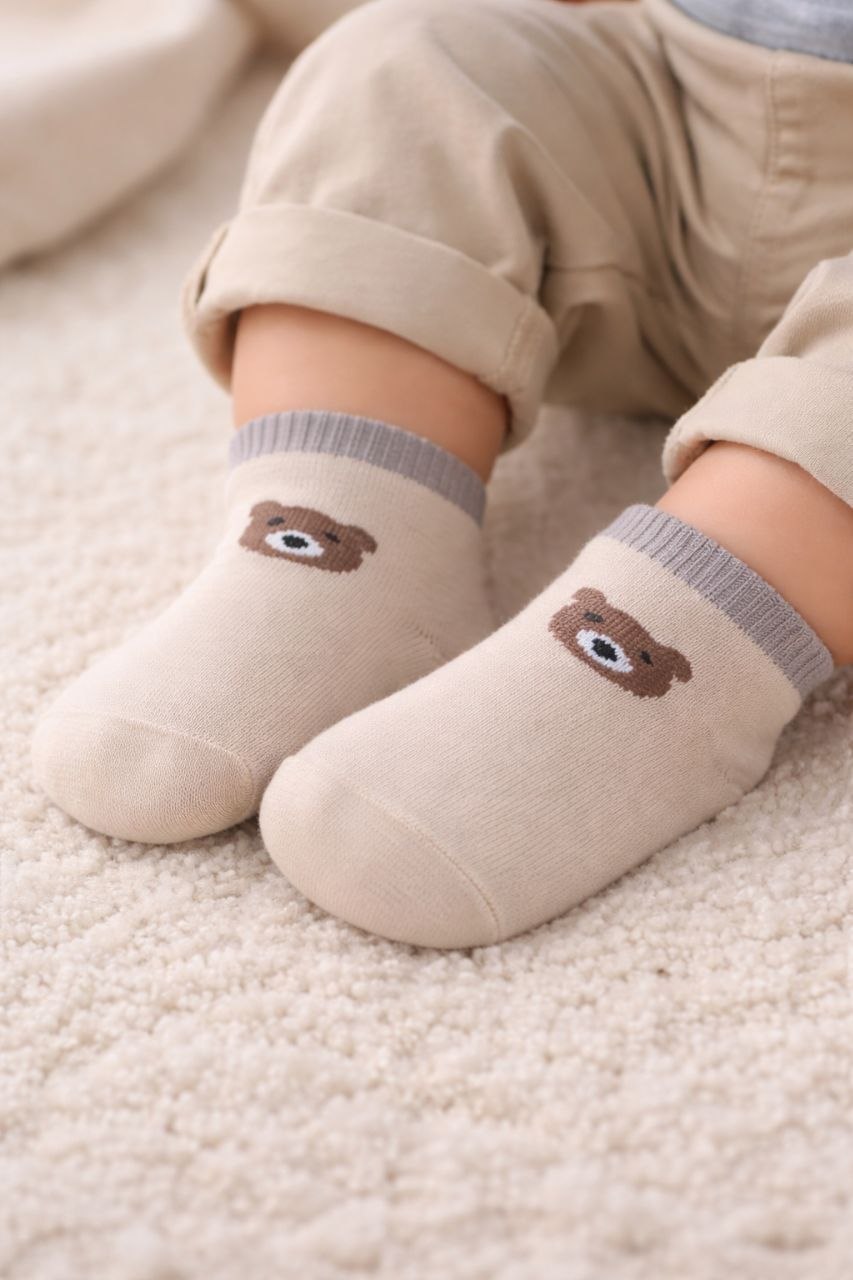 جوراب دخترانه نخ هندی درجه یک طرح تدی زمینه کرم