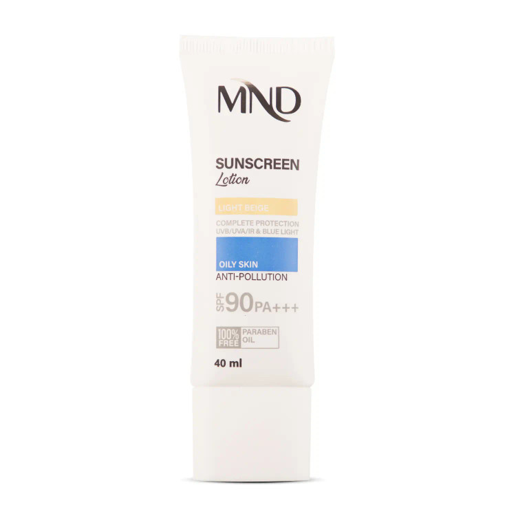 افراد دارای پوست چرب نیز باید از محصولات ضدآفتاب برای محافظت از پوست خود استفاده کنند و لوسیون ضدآفتاب بژ روشن با فاکتور حفاظتی 90 برند MND برای این افراد و بدون روغن تولید شده است. در این لوسیون از فیلترهایی استفاده شده که قادرند از ورود اشعههای UVA و UVB خورشید به پوست جلوگیری کنند. در کنار این ترکیبات، از عصاره ساقه/برگ/گل لادن به منظور جلوگیری از تاثیر مخرب نور آبی ساطع شده از وسایل الکترونیکی پیرامون انسان بر پوست و عصاره علف هفتبند برای ممانعت از آسیب دیدن فیبرهای پروتئینی پوست توسط اشعه مادون قرمز کمک گرفته شده است تا پوست به صورت کامل در برابر انواع طیفهای نوری محافظت شود. این محصول ترکیباتی مانند زینک پیسیای، پیریدوکسین فسفات حلقوی و عصاره برگ به را نیز در خود دارند که با کاهش دادن ترشح سبوم (چربی طبیعی سطح پوست) موجب بهبود شرایط پوست چرب میشوند. همچنین این محصول حاوی عصاره گل کاملیا ژاپنی را نیز میباشد که تولید ترکیبات التهابی توسط ذرات معلق و فلزات سنگین را کاهش میدهد و به همین دلیل این محصول قادر به حفاظت موثر از پوست در برابر آلودگی محیطی است.
