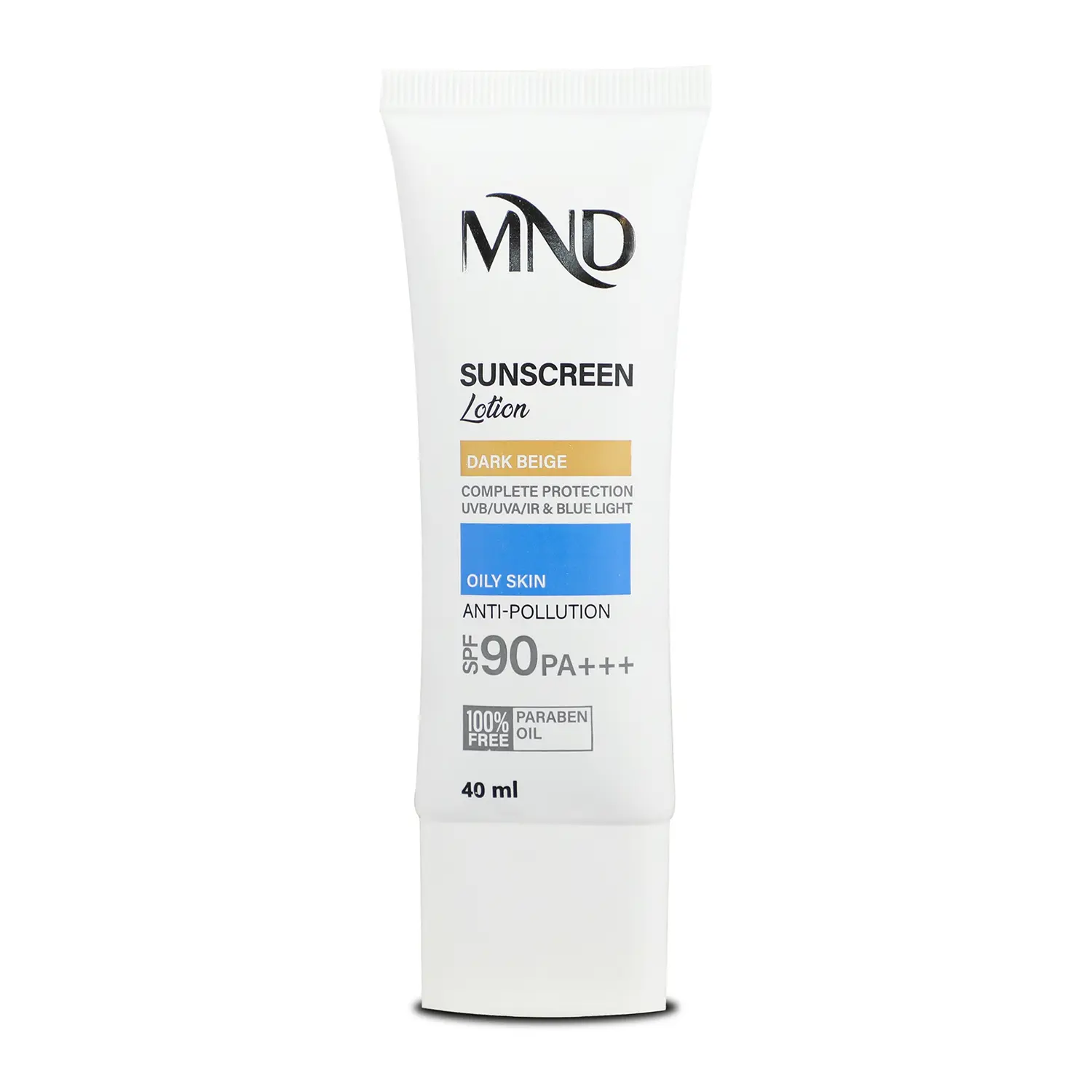 افراد دارای پوست چرب نیز باید از محصولات ضدآفتاب برای محافظت از پوست خود استفاده کنند و لوسیون ضدآفتاب بژ تیره با فاکتور حفاظتی 90 برند MND برای این افراد و بدون روغن تولید شده است. در این لوسیون از فیلترهایی استفاده شده که قادرند از ورود اشعههای UVA و UVB خورشید به پوست جلوگیری کنند. در کنار این ترکیبات، از عصاره ساقه/برگ/گل لادن به منظور جلوگیری از تاثیر مخرب نور آبی ساطع شده از وسایل الکترونیکی پیرامون انسان بر پوست و عصاره علف هفتبند برای ممانعت از آسیب دیدن فیبرهای پروتئینی پوست توسط اشعه مادون قرمز کمک گرفته شده است تا پوست به صورت کامل در برابر انواع طیفهای نوری محافظت شود. این محصول ترکیباتی مانند زینک پیسیای، پیریدوکسین فسفات حلقوی و عصاره برگ به را نیز در خود دارند که با کاهش دادن ترشح سبوم (چربی طبیعی سطح پوست) موجب بهبود شرایط پوست چرب میشوند. همچنین این محصول حاوی عصاره گل کاملیا ژاپنی را نیز میباشد که تولید ترکیبات التهابی توسط ذرات معلق و فلزات سنگین را کاهش میدهد و به همین دلیل این محصول قادر به حفاظت موثر از پوست در برابر آلودگی محیطی است.