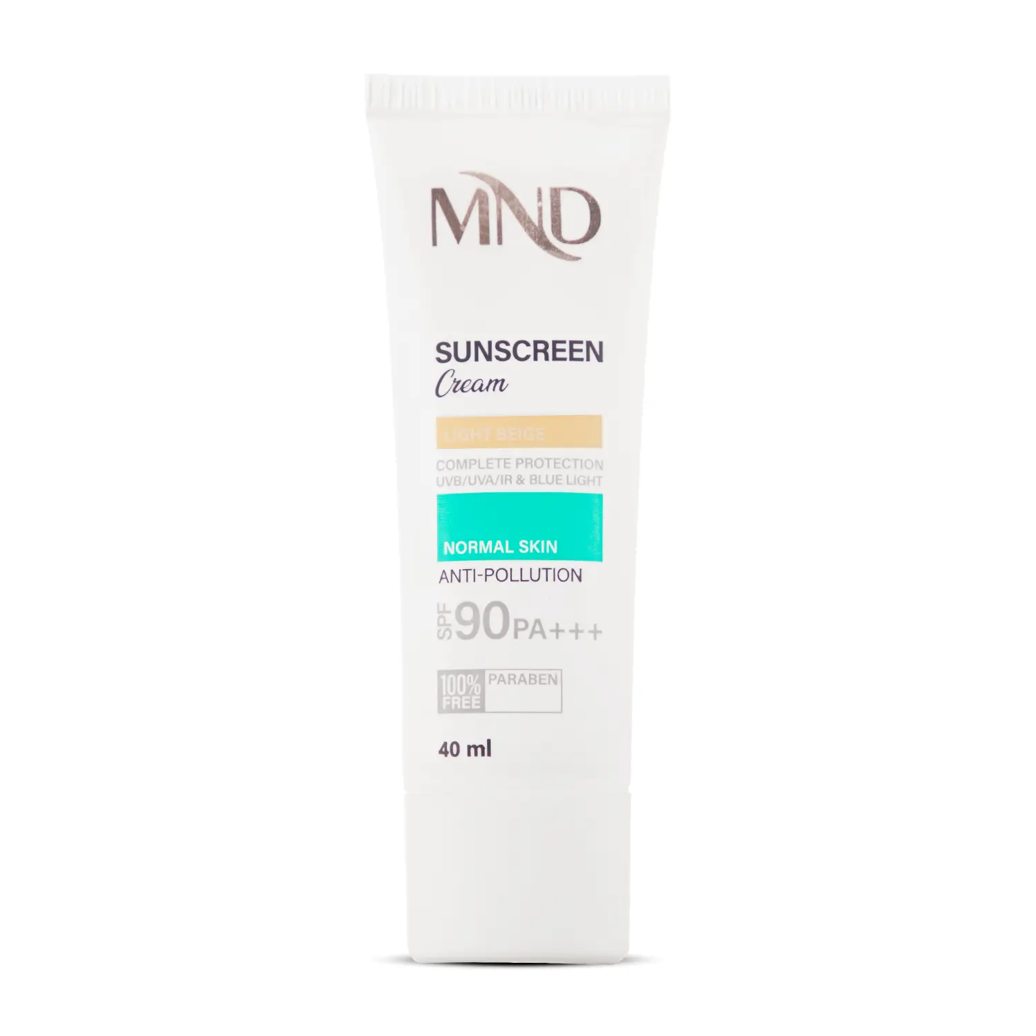 کرم ضدآفتاب بژ روشن با فاکتور حفاظتی 90 برند MND برای پوستهای معمولی تهیه شده است و فیلترهای استفاده شده در آن قابلیت جلوگیری از ورود اشعههای UVA و UVB خورشید به پوست را دارند. همچنین در این محصول، از عصاره علف هفتبند برای جلوگیری از اثر تخریبی اشعه مادون قرمز بر روی فیبرهای پروتئینی پوست و عصاره ساقه/برگ/گل لادن برای ممانعت از اثرگذاری سوء نور آبی ساطع شده از وسایل الکترونیکی پیرامون انسان بر پوست کمک گرفته شده است تا محافظت کاملی از پوست در برابر طیف وسیعی از اشعهها، حاصل شود. علاوه بر اینها از منگنز پیسیای، نیاسینامید (ویتامین ب 3) و مشتقات پایدار ویتامین سی برای تقویت و ارتقا سلامت پوست کمک گرفته شده که به همراه عصاره آلوئهورا موجب حفظ جوانی و شادابی پوست میشوند. روغن مورد استفاده در این کرم ضدآفتاب، روغن هسته آرگان میباشد که ترکیب متعادلی از انواع اسیدهای چرب را در خود داشته و به خوبی نیازهای پوست نسبت به اسیدهای چرب را تامین میکند. با توجه به اینکه محصولات ضدآفتاب اکثرا در محیط بیرون منزل مورد استفاده قرار میگیرند، از عصاره گل کاملیا ژاپنی نیز در این کرم استفاده شده تا ذرات معلق و فلزات سنگین موجود در محیط پیرامون افراد نتوانند با تولید ترکیبات آسیبزا و التهابی به پوست آنها آسیب برسانند.