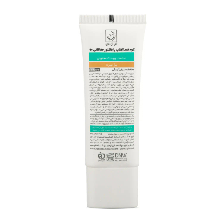کرم ضدآفتاب بژ تیره با فاکتور حفاظتی 90 برند MND برای پوستهای معمولی تهیه شده است و فیلترهای استفاده شده در آن قابلیت جلوگیری از ورود اشعههای UVA و UVB خورشید به پوست را دارند. همچنین در این محصول، از عصاره علف هفتبند برای جلوگیری از اثر تخریبی اشعه مادون قرمز بر روی فیبرهای پروتئینی پوست و عصاره ساقه/برگ/گل لادن برای ممانعت از اثرگذاری سوء نور آبی ساطع شده از وسایل الکترونیکی پیرامون انسان بر پوست کمک گرفته شده است تا محافظت کاملی از پوست در برابر طیف وسیعی از اشعهها، حاصل شود. علاوه بر اینها از منگنز پیسیای، نیاسینامید (ویتامین ب 3) و مشتقات پایدار ویتامین سی برای تقویت و ارتقا سلامت پوست کمک گرفته شده که به همراه عصاره آلوئهورا موجب حفظ جوانی و شادابی پوست میشوند. روغن مورد استفاده در این کرم ضدآفتاب، روغن هسته آرگان میباشد که ترکیب متعادلی از انواع اسیدهای چرب را در خود داشته و به خوبی نیازهای پوست نسبت به اسیدهای چرب را تامین میکند. با توجه به اینکه محصولات ضدآفتاب اکثرا در محیط بیرون منزل مورد استفاده قرار میگیرند، از عصاره گل کاملیا ژاپنی نیز در این کرم استفاده شده تا ذرات معلق و فلزات سنگین موجود در محیط پیرامون افراد نتوانند با تولید ترکیبات آسیبزا و التهابی به پوست آنها آسیب برسانند.