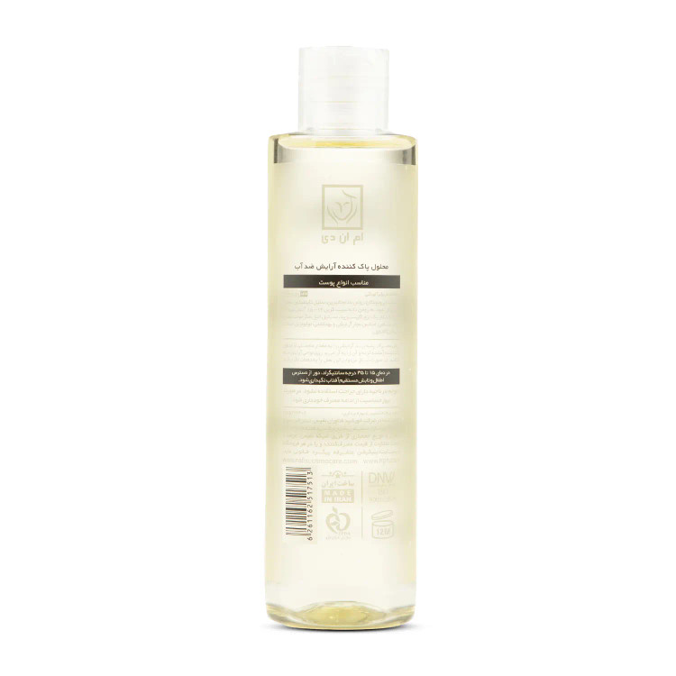 محلول پاک کننده آرایش ضدآب MND ایزودودکان و سایر امولینتهای روغندوست را در خود دارد که به راحتی مواد و رنگدانههای آبگریز را از سطح پوست جدا کرده و پوست را عاری از این ترکیبات میکنند. چون نگه داشتن آرایش برای مدت طولانی بر روی پوست میتواند به ملتهب شدن پوست ختم شود، در این پاککننده آرایش ضدآب، از عصاره روغنی گل بابونه استفاده شده که قرمزی و ناراحتی احتمالی پوست را کاهش میدهد. همچنین برای اینکه پوست بعد از پاک شدن، خشک نشود، از روغن بادام شیرین و روغن دانه سیب هم کمک گرفته شده تا پوست نرم شود و سد دفاعی آن آسیب نبیند. به منظور محافظت دائمی از پوست دربرابر آلودگی محیطی هم عصاره جوانه شاهی بکار گرفته شده است که پوست را برای مقابله با عوامل بیرونی تقویت میکند.