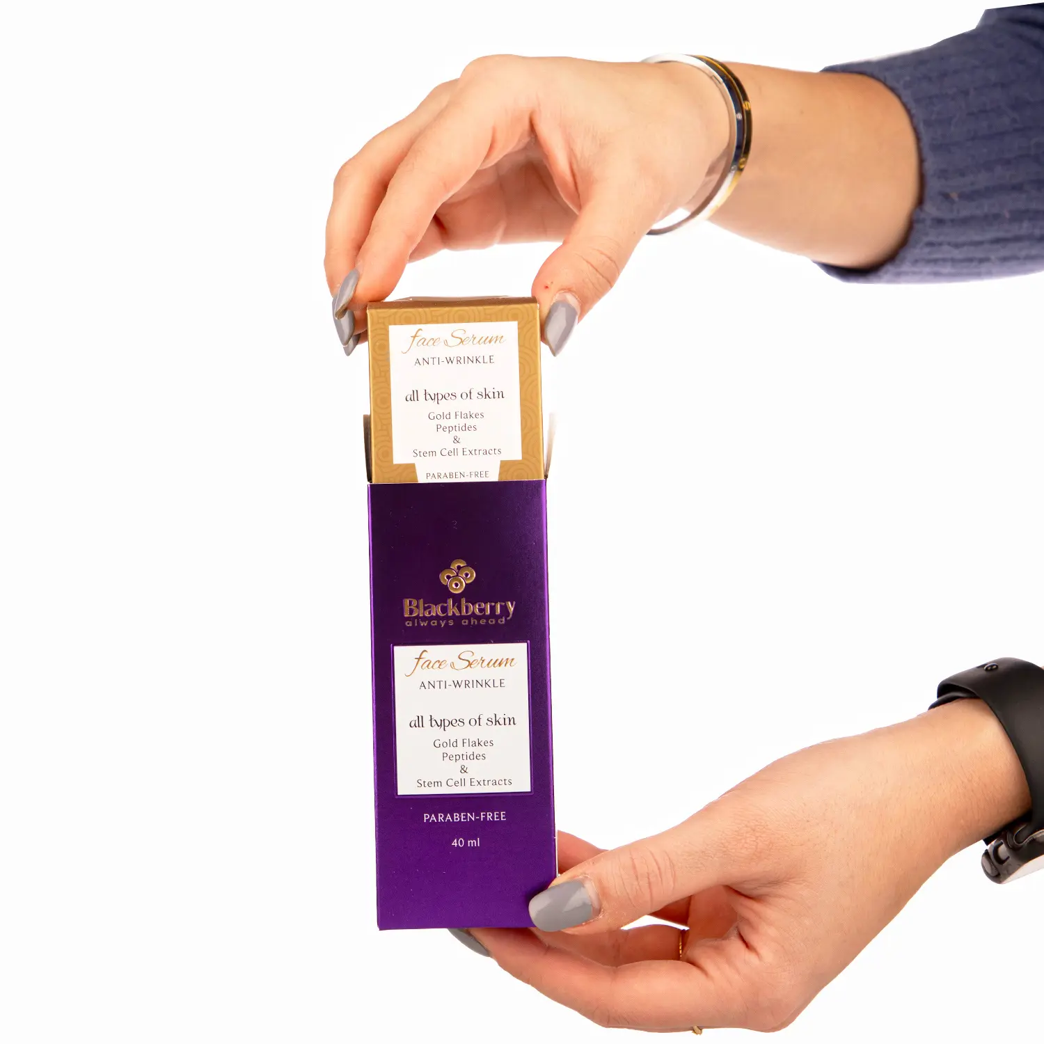 سلولهای بنیادی پوست انسان در درم و همچنین پائینترین لایه اپیدرم قرار دارند که نقش بازسازی پوست و جوان نگهداشتن پوست را به عهده دارند. تعداد این سلولها با گذشت زمان کاهش یافته و فعالیتشان کاسته می شود و قادر نیستند وظایف خود را به خوبی انجام دهند که نتیجه آن پیر شدن پوست است. عصاره سلولهای بنیادی سیب بکار رفته در سرم ضدچروک Bَlackberry عوامل اپیژنتیک (Epigenetic)، انواع متابولیت (Metabolite) و... را در خود دارد که علاوه بر افزایش دادن طول عمر سلولهای بنیادی پوست و کمک به رشد آنها، باعث افزایش عمر مفید و توانایی سلولهای فیبروبلاست نیز میشوند که نقش بسیار حیاتی در جوان ماندن پوست دارند. این سرم حاوی عصاره سلولهای بنیادی آرگان نیز میباشد که سبب نوسازی سلولهای بنیادی پوست شده و به همراه عصاره سلولهای بنیادی انگور، از آسیبدیدن این سلولهای مهم پوست توسط اشعه ماورای بنفش خورشید جلوگیری میکنند. چون رادیکالهای آزاد اکسیژن از دیگر عوامل مهم آسیبرسان به پوست میباشند باید تولید و انباشت آنها در سلولهای پوست نیز توسط یک محصول ضدچروک مناسب مدیریت شود که بدین منظور از عصاره دانه چیا استفاده شده است که خواص آنتی اکسیدانی را داراست اما علاوه بر آن، به دلیل پلیساکاریدی بودن قادر است رطوبت پوست را افزایش داده و با تشکیل لایهای بر روی پوست از ایجاد رادیکالهای اکسیژن به دلیل عوامل محیطی جلوگیری کند. لازم به تاکید است که این محصول عصاره پلانکتون و عصاره جلبک اسپیرولینا پلاتنسیس را نیز در خود دارد که علاوه بر کمک به مرطوب شدن پوست باعث تحریک کلاژنسازی میشوند اما این محصول انواع پپتیدهای محرک تولید اجزای ساختاری پوست مانند کلاژن، الاستین، اسید هیالورونیک و... را نیز درخود دارد تا با ازدیاد تولید آنها، پوست ضخامت طبیعی و کشسانی اولیه خود را بدست آورده و سفت شود. به عنوان مکمل ترکیبات فوق نیز از عصاره دانه ذرت بهره گرفته شده است تا انرژی سلولی لازم برای تولید این ترکیبات نیز تامین شده و بهترین نتیجه حاصل شود.