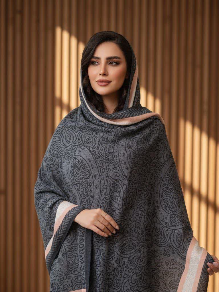 شال پاییزه نخی ترنج پارچه زنبوری خاکستری گلبهی